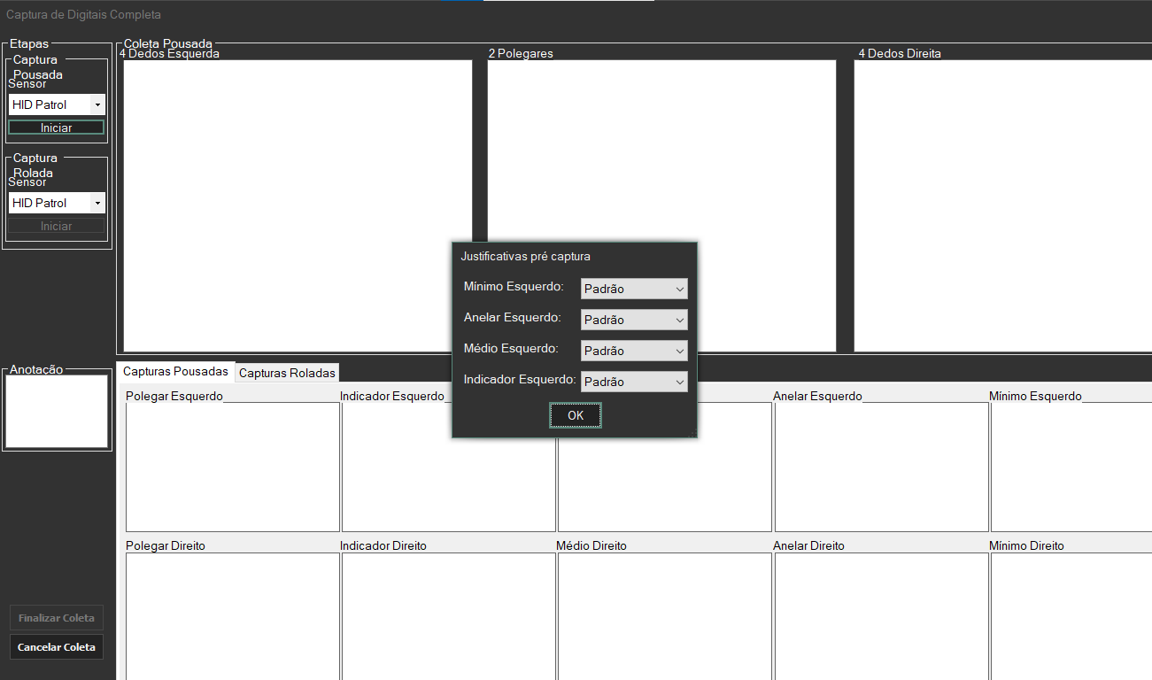 1. Seguindo fluxo de captura, clique em “Iniciar” na opção de captura rolada. Na tela será mostrado o dedo a ser capturado e o pop-up de justificativa, para seguir sem justificativa clique em “OK” e prossiga com a captura assim como na etapa de captura anterior: