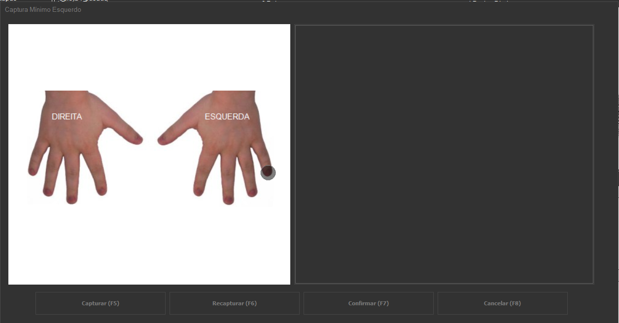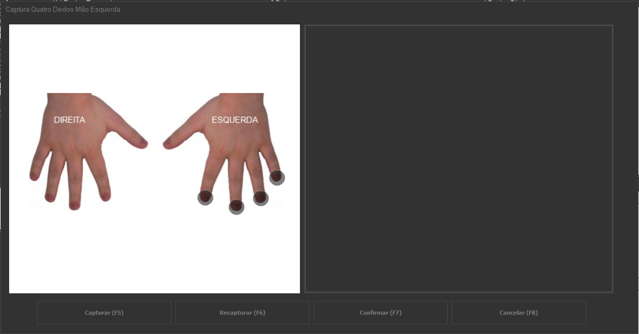 4. Após clicar em “Ok” será aberta uma nova tela para realização da captura dos 4 dedos da mão esquerda. Nessa tela a captura será mostrada em tempo real, clique em “Capturar” e em seguida em “Confirmar”: