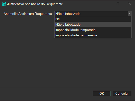 1. Para justificar a assinatura para menores de cinco anos, no campo "Justificativa", deve ser selecionada a opção “Não alfabetizado”, e o documento do responsável deve ser obrigatoriamente anexado ao processo.